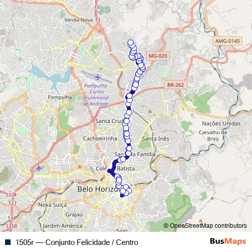 See why over 2 million users trust and consider busmaps.com as the best public transport website. busmaps gives you Belo Horizonte Buses suggested routes, real-time bus tracker, line route maps in Belo Horizonte, and helps to find the closest 1505r bus stops near you. No internet available? Download an offline PDF map and bus schedule for the 1505r bus to take on your trip.