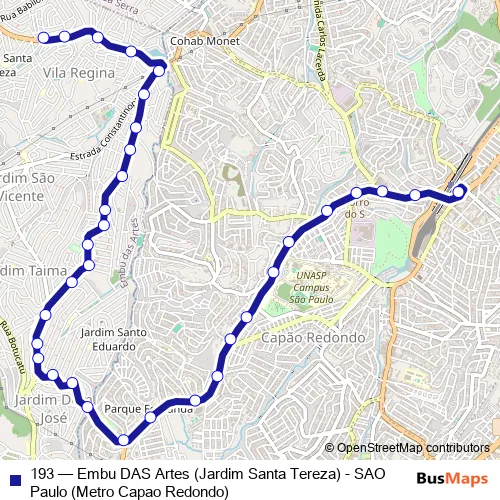 The first stop of the 193 bus route is Estr. de Itapecerica 4010 - Parada Capao Redondo I - Cidade Auxiliadora Sao Paulo - SP 05858-005 Brasil and the last stop is R. Belgrado 15 - Vila Olinda Embu das Artes - SP 06810-270 Brasil. 193 (Embu DAS Artes (Jardim Santa Tereza) - SAO Paulo (Metro Capao Redondo)) is operational during everyday.