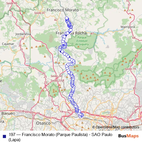 The first stop of the 197 bus route is Rua William Speers (Estacao Lapa) and the last stop is Av. Sao Paulo 1657 - Parque Paulista Francisco Morato - SP 07903-200 Brasil. 197 (Francisco Morato (Parque Paulista) - SAO Paulo (Lapa)) is operational during everyday.
