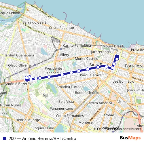 The first stop of the 200 bus route is Praça Terminal Antonio Bezerra, Sn and the last stop is Praça Terminal José DE Alencar, S/N. 200 (Antônio Bezerra/BRT/Centro) is operational during everyday.