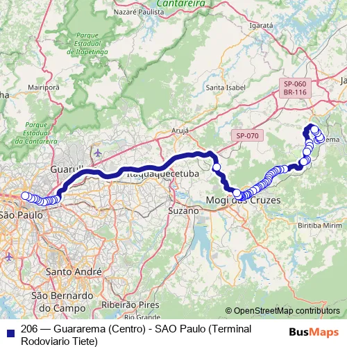 The first stop of the 206 bus route is Av. Antonio Teixeira Muniz 1501 - Ipiranga Guararema - SP 08900-000 Brasil and the last stop is Terminal Rodoviario Tiete. 206 (Guararema (Centro) - SAO Paulo (Terminal Rodoviario Tiete)) is operational during on weekdays.