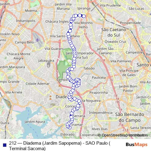 The first stop of the 212 bus route is Passagem Palmeira Real 138 - Eldorado Diadema - SP 99732-233 Brasil and the last stop is Terminal Sacoma. 212 (Diadema (Jardim Sapopema) - SAO Paulo (Terminal Sacoma)) is operational during on weekdays.