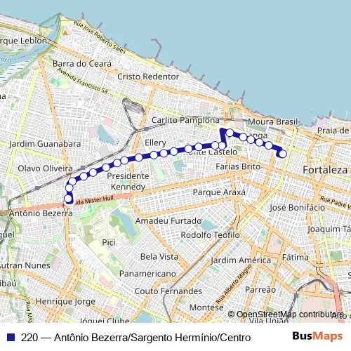 The first stop of the 220 bus route is Praça Terminal José DE Alencar, S/N and the last stop is Praça Terminal Antonio Bezerra, Sn. 220 (Antônio Bezerra/Sargento Hermínio/Centro) is operational during everyday.