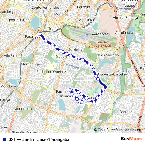 See why over 2 million users trust and consider busmaps.com as the best public transport website. busmaps gives you Fortaleza Buses suggested routes, real-time bus tracker, line route maps in Fortaleza, and helps to find the closest 321 bus stops near you. No internet available? Download an offline PDF map and bus schedule for the 321 bus to take on your trip.