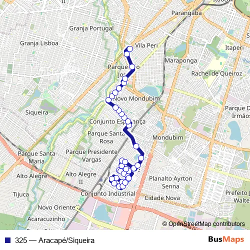 The first stop of the 325 bus route is Avenida Miguel Aragao, 1161 and the last stop is Praça Terminal Siqueira, Sn. 325 (Aracapé/Siqueira) is operational during everyday.