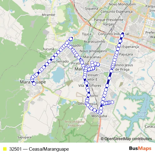 The first stop of the 32501 bus route is Terminal Rodoviario de Maranguape and the last stop is CE 060 Ceasa Pajucara. 32501 (Ceasa/Maranguape) is operational during everyday.