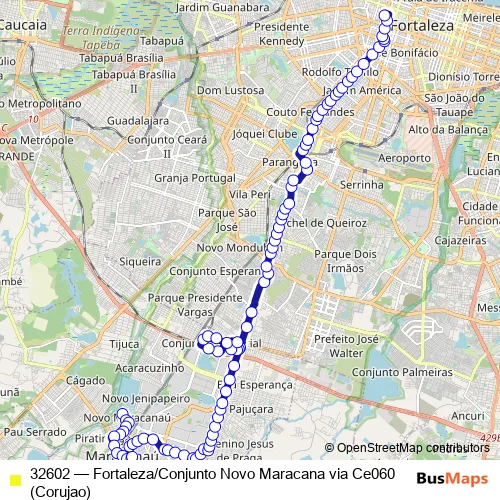 The first stop of the 32602 bus route is Rua Dois 370 Novo Maracanau and the last stop is Avenida Imperador Seletivo Viametro (1331 1332 324) Centro. 32602 (Fortaleza/Conjunto Novo Maracana via Ce060 (Corujao)) is operational during everyday.