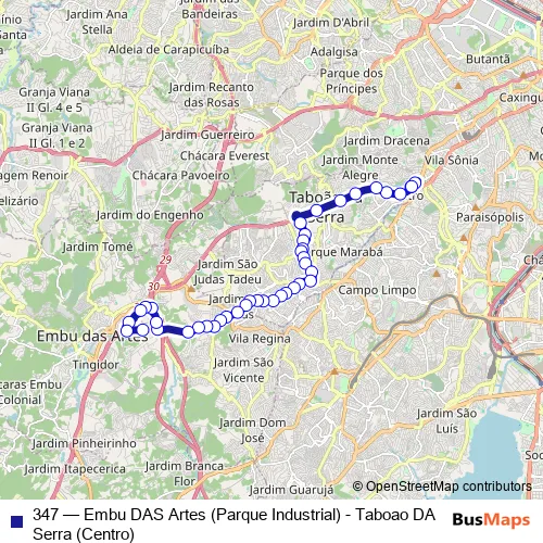See why over 2 million users trust and consider busmaps.com as the best public transport website. busmaps gives you Taboao da Serra Buses suggested routes, real-time bus tracker, line route maps in Taboao da Serra, and helps to find the closest 347 bus stops near you. No internet available? Download an offline PDF map and bus schedule for the 347 bus to take on your trip.