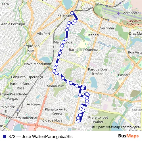 The first stop of the 373 bus route is RUA 62 CJ José Walter, Sn and the last stop is Praça Terminal Parangaba, Sn. 373 (José Walter/Parangaba/Sfs) is operational during on weekends.