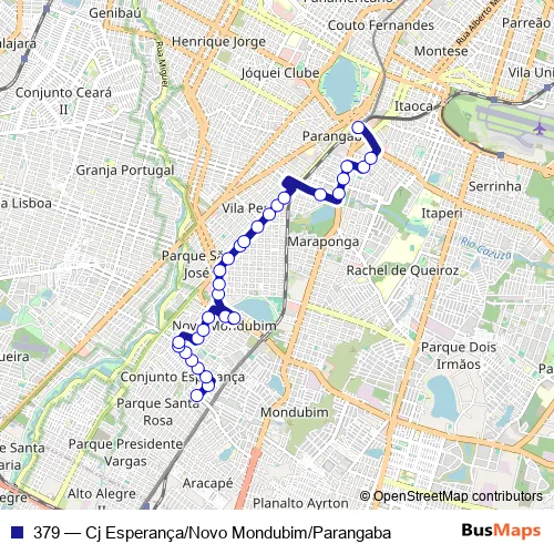The first stop of the 379 bus route is Avenida B CJ Esperança, 101 and the last stop is Praça Terminal Parangaba, Sn. 379 (Cj Esperança/Novo Mondubim/Parangaba) is operational during everyday.