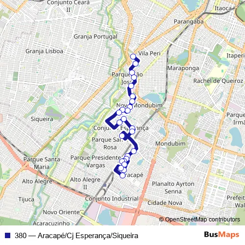 The first stop of the 380 bus route is Praça Terminal Siqueira, Sn and the last stop is Avenida Miguel Aragao, 1161. 380 (Aracapé/Cj Esperança/Siqueira) is operational during everyday.