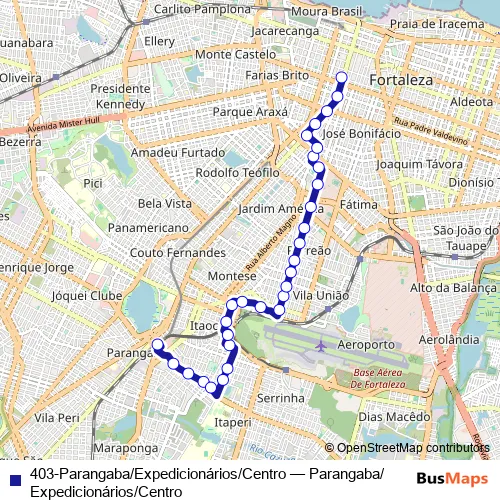 See why over 2 million users trust and consider busmaps.com as the best public transport website. busmaps gives you Fortaleza Buses suggested routes, real-time bus tracker, line route maps in Fortaleza, and helps to find the closest 403-Parangaba/Expedicionários/Centro bus stops near you. No internet available? Download an offline PDF map and bus schedule for the 403-Parangaba/Expedicionários/Centro bus to take on your trip.