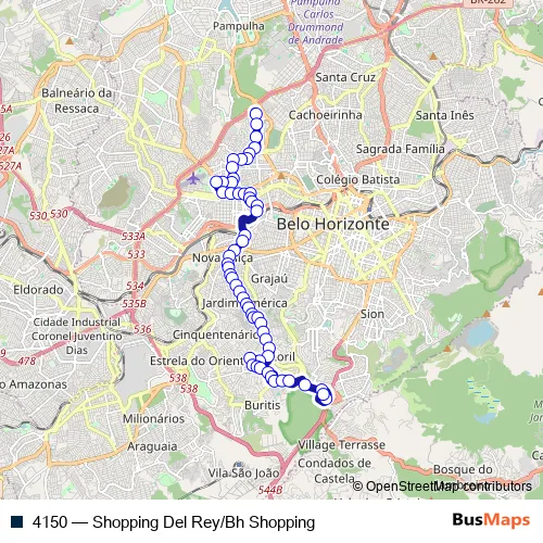 The first stop of the 4150 bus route is Avenida Del Rey 5 and the last stop is Rua Maria Luiza Santiago 550. 4150 (Shopping Del Rey/Bh Shopping) is operational during everyday.