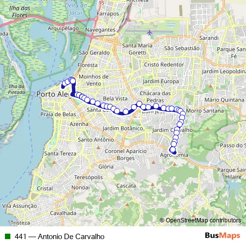 The first stop of the 441 bus route is Julio De Castilhos Al 131 and the last stop is Bento Goncalves 6670. 441 (Antonio De Carvalho) is operational during everyday.