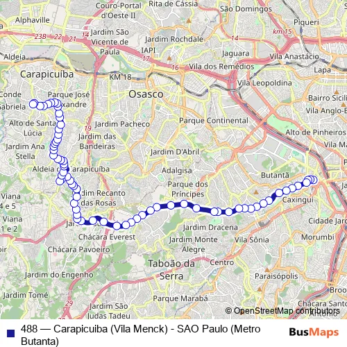 The first stop of the 488 bus route is Terminal Metro Butanta and the last stop is Terminal Municipal Villa Menck Vila America Carapicuiba - SP 06395-010 Brasil. 488 (Carapicuiba (Vila Menck) - SAO Paulo (Metro Butanta)) is operational during everyday.
