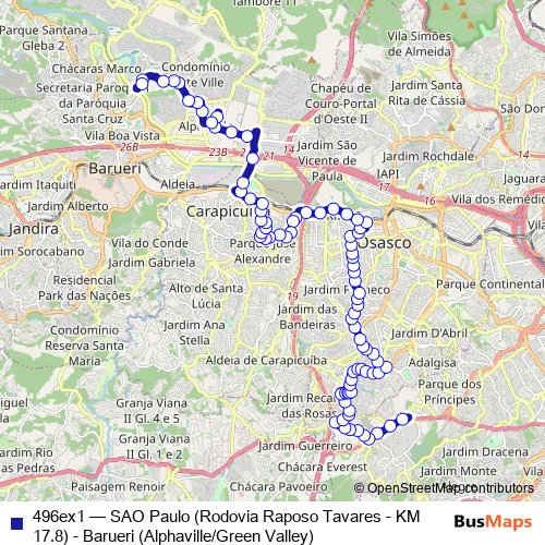 Click here to view the nearest 496ex1 - SAO Paulo (Rodovia Raposo Tavares - KM 17.8) - Barueri (Alphaville/Green Valley) bus stop.