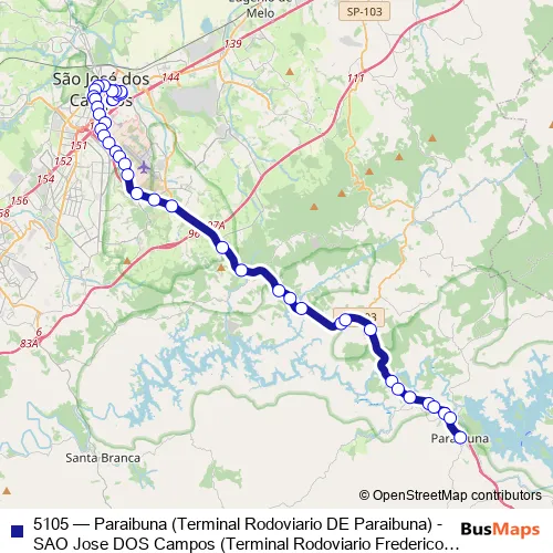 The first stop of the 5105 bus route is Terminal Rodoviario Frederico Ozanam and the last stop is Terminal Rodoviario de Paraibuna. 5105 (Paraibuna (Terminal Rodoviario DE Paraibuna) - SAO Jose DOS Campos (Terminal Rodoviario Frederico Ozanam)) is operational during everyday.
