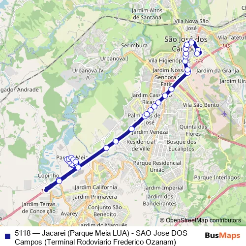 Rua Dep. Arnaldo Laurindo 112 - Ponto Final da Linha 5118 - Parque Meia Lua Jacarei - SP 12335-000 Brasil ➞ Terminal Rodoviario Frederico Ozanam