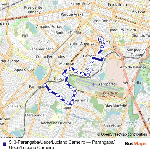 See why over 2 million users trust and consider busmaps.com as the best public transport website. busmaps gives you Fortaleza Buses suggested routes, real-time bus tracker, line route maps in Fortaleza, and helps to find the closest 513-Parangaba/Uece/Luciano Carneiro bus stops near you. No internet available? Download an offline PDF map and bus schedule for the 513-Parangaba/Uece/Luciano Carneiro bus to take on your trip.