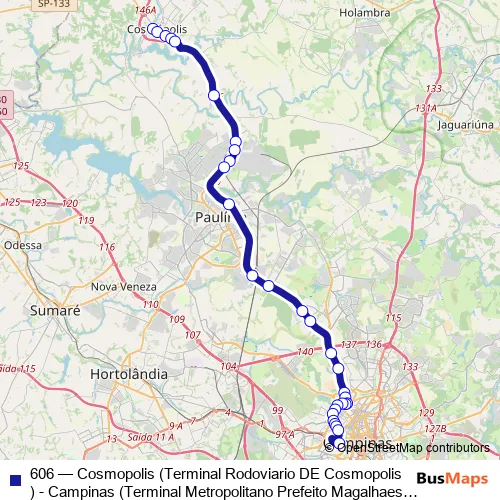 Bus 606 - Cosmopolis (Terminal Rodoviario DE Cosmopolis) - Campinas (Terminal Metropolitano Prefeito Magalhaes Teixeira): Full Schedule in Paulinia
