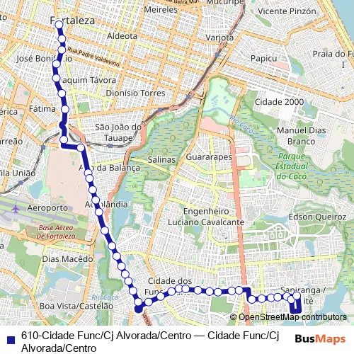 See why over 2 million users trust and consider busmaps.com as the best public transport website. busmaps gives you Fortaleza Buses suggested routes, real-time bus tracker, line route maps in Fortaleza, and helps to find the closest 610-Cidade Func/Cj Alvorada/Centro bus stops near you. No internet available? Download an offline PDF map and bus schedule for the 610-Cidade Func/Cj Alvorada/Centro bus to take on your trip.
