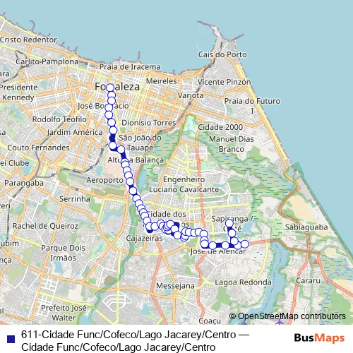 See why over 2 million users trust and consider busmaps.com as the best public transport website. busmaps gives you Fortaleza Buses suggested routes, real-time bus tracker, line route maps in Fortaleza, and helps to find the closest 611-Cidade Func/Cofeco/Lago Jacarey/Centro bus stops near you. No internet available? Download an offline PDF map and bus schedule for the 611-Cidade Func/Cofeco/Lago Jacarey/Centro bus to take on your trip.