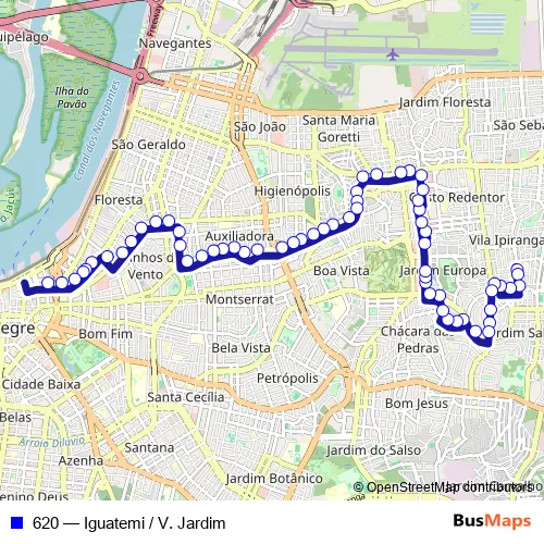 The first stop of the 620 bus route is Benno Mentz Df 1560 Praça Cabrália and the last stop is Voluntarios Da Patria 584. 620 (Iguatemi / V. Jardim) is operational during everyday.