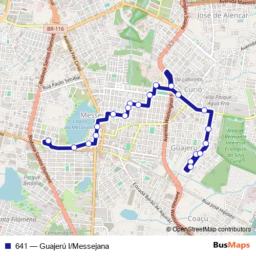 The first stop of the 641 bus route is RUA Socorro Gomes, 287 and the last stop is Praça Terminal Messejana, Sn. 641 (Guajerú I/Messejana) is operational during everyday.