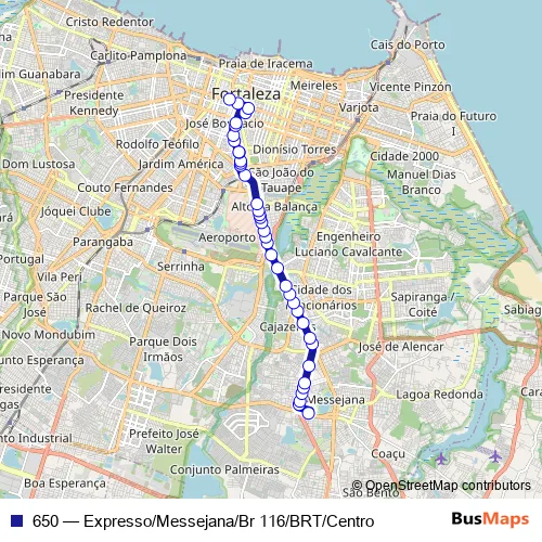 See why over 2 million users trust and consider busmaps.com as the best public transport website. busmaps gives you Fortaleza Buses suggested routes, real-time bus tracker, line route maps in Fortaleza, and helps to find the closest 650 bus stops near you. No internet available? Download an offline PDF map and bus schedule for the 650 bus to take on your trip.