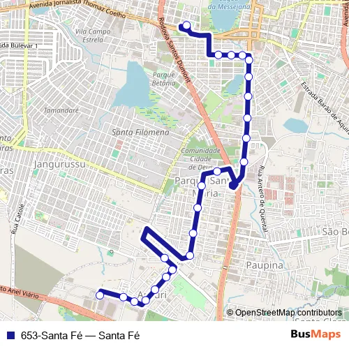 See why over 2 million users trust and consider busmaps.com as the best public transport website. busmaps gives you Fortaleza Buses suggested routes, real-time bus tracker, line route maps in Fortaleza, and helps to find the closest 653-Santa Fé bus stops near you. No internet available? Download an offline PDF map and bus schedule for the 653-Santa Fé bus to take on your trip.