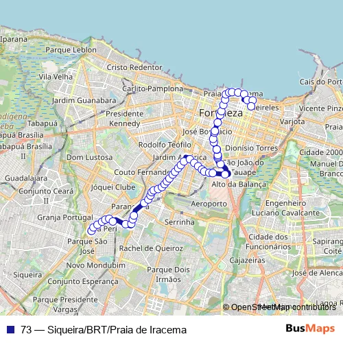 The first stop of the 73 bus route is Praça Terminal Siqueira, Sn and the last stop is Avenida RUI Barbosa, 492. 73 (Siqueira/BRT/Praia de Iracema) is operational during everyday.