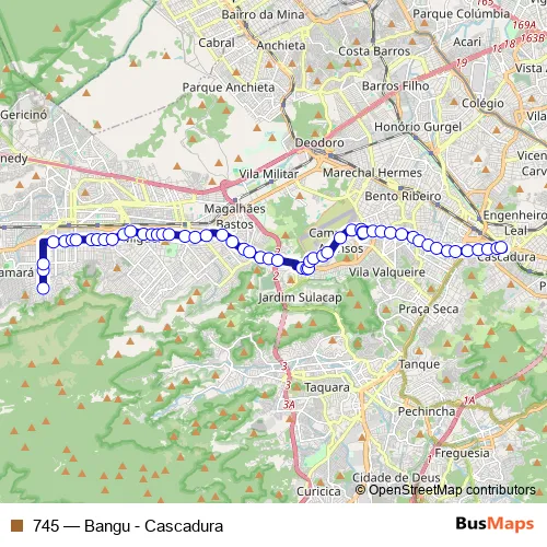 The first stop of the 745 bus route is Ponto Final: Bangu : Rua Boiobi and the last stop is Terminal Deputado José de Souza Marques : Plat. B. 745 (Bangu - Cascadura) is operational during everyday.