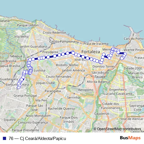 See why over 2 million users trust and consider busmaps.com as the best public transport website. busmaps gives you Fortaleza Buses suggested routes, real-time bus tracker, line route maps in Fortaleza, and helps to find the closest 76 bus stops near you. No internet available? Download an offline PDF map and bus schedule for the 76 bus to take on your trip.