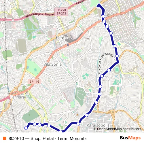 The first stop of the 8029-10 bus route is Av. Mal. Juarez Távora, 553 and the last stop is Terminal Morumbi. 8029-10 (Shop. Portal - Term. Morumbi) is operational during everyday.