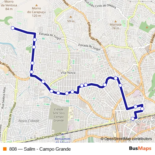 The first stop of the 808 bus route is Ponto Final: Campo Grande : Linhas para Zona Oeste (via Rua Barcelos Domingos) and the last stop is Ponto Final: Salim. 808 (Salim - Campo Grande) is operational during on weekdays.