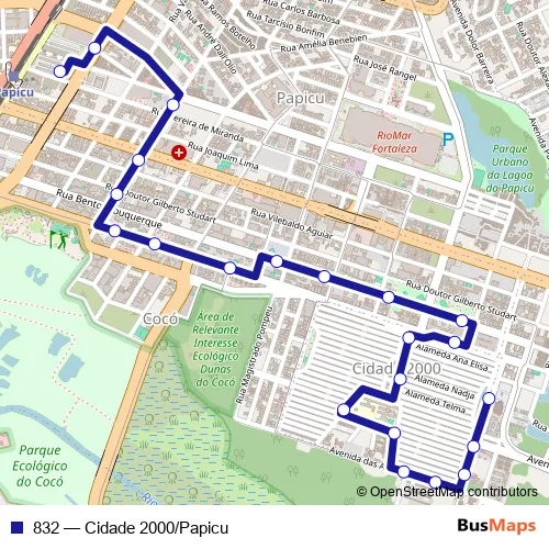 The first stop of the 832 bus route is Avenida Castanholeiras, 155 and the last stop is Praça Terminal Papicu, Sn. 832 (Cidade 2000/Papicu) is operational during everyday.