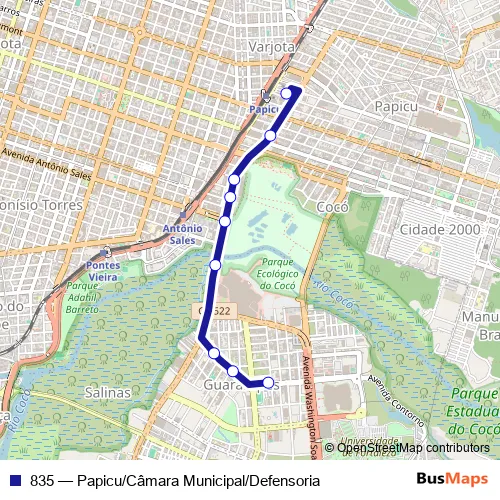 See why over 2 million users trust and consider busmaps.com as the best public transport website. busmaps gives you Fortaleza Buses suggested routes, real-time bus tracker, line route maps in Fortaleza, and helps to find the closest 835 bus stops near you. No internet available? Download an offline PDF map and bus schedule for the 835 bus to take on your trip.
