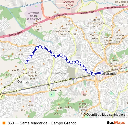 The first stop of the 869 bus route is Jamacaru and the last stop is Ponto Final: Campo Grande : Linhas para Zona Oeste (via Rua Barcelos Domingos). 869 (Santa Margarida - Campo Grande) is operational during everyday.