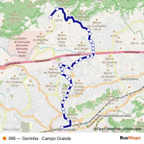 The first stop of the 895 bus route is Ponto Final: Campo Grande : Linhas para Zona Oeste (via Rua Lucília) and the last stop is Ponto Final: Serrinha : Linha 895. 895 (Serrinha - Campo Grande) is operational during everyday.