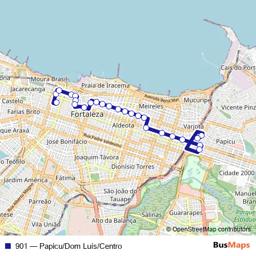 The first stop of the 901 bus route is Praça Terminal José DE Alencar, S/N and the last stop is Praça Terminal Papicu, Sn. 901 (Papicu/Dom Luís/Centro) is operational during everyday.