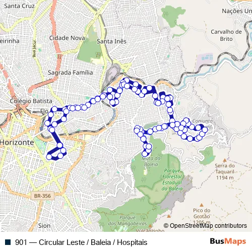 The first stop of the 901 bus route is Rua Benjamim Guimaraes 1 and the last stop is Rua Benjamim Guimaraes 1. 901 (Circular Leste / Baleia / Hospitais) is operational during everyday.