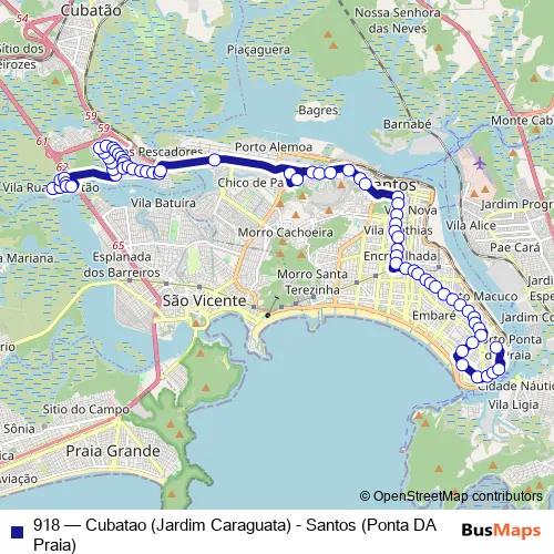 The first stop of the 918 bus route is R. Jose Ramos Ferreira 14 - Vila Sao Benedito Cubatao - SP 11535-300 Brasil and the last stop is Av. Dr. Pedro Lessa 515 - Ponta da Praia Santos - SP 11025-001 Brasil. 918 (Cubatao (Jardim Caraguata) - Santos (Ponta DA Praia)) is operational during everyday.