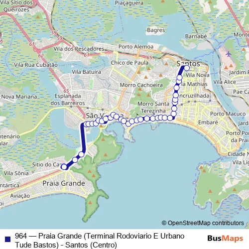 The first stop of the 964 bus route is Terminal Rodoviario e Urbano Tude Bastos and the last stop is Avenida Sao Francisco 128. 964 (Praia Grande (Terminal Rodoviario E Urbano Tude Bastos) - Santos (Centro)) is operational during everyday.