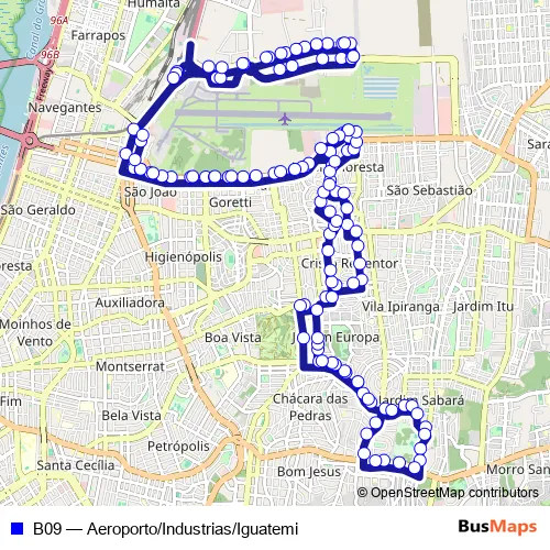 The first stop of the B09 bus route is Industrias 1290 and the last stop is Severo Dullius 2015. B09 (Aeroporto/Industrias/Iguatemi) is operational during everyday.