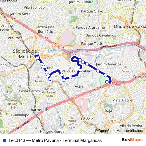 The first stop of the Lecd143 bus route is Ponto Final: Pavuna : Linha 944 and the last stop is Terminal Margaridas : Linhas Alimentadoras. Lecd143 (Metrô Pavuna - Terminal Margaridas) is operational during everyday.