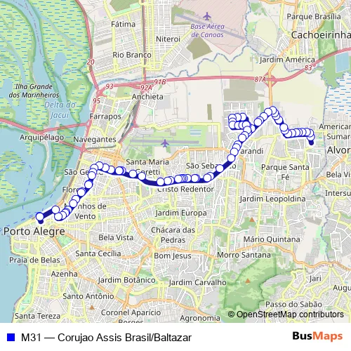 See why over 2 million users trust and consider busmaps.com as the best public transport website. busmaps gives you Alvorada Buses suggested routes, real-time bus tracker, line route maps in Alvorada, and helps to find the closest M31 bus stops near you. No internet available? Download an offline PDF map and bus schedule for the M31 bus to take on your trip.