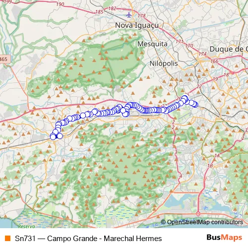 The first stop of the Sn731 bus route is Ponto Final: Marechal Hermes : João Vicente (Linhas via Água Branca) and the last stop is Ponto Final: Campo Grande : Linhas para Zona Norte. Sn731 (Campo Grande - Marechal Hermes) is operational during everyday.