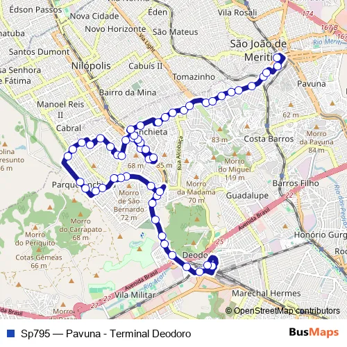 The first stop of the Sp795 bus route is Terminal Deodoro : Plataforma F9 and the last stop is Ponto Final: Pavuna : Comendador Guerra (Linha 793). Sp795 (Pavuna - Terminal Deodoro) is operational during everyday.