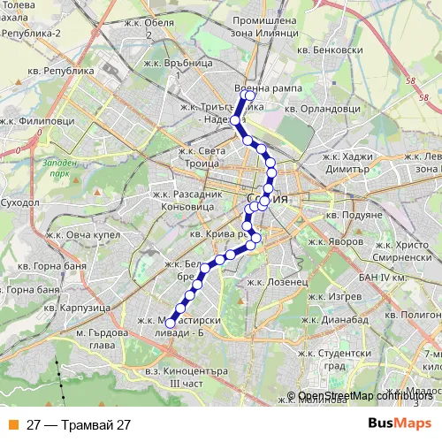 See why over 2 million users trust and consider busmaps.com as the best public transport website. busmaps gives you Sofia Trams suggested routes, real-time bus tracker, line route maps in Sofia, and helps to find the closest 27 tram stops near you. No internet available? Download an offline PDF map and bus schedule for the 27 tram to take on your trip.
