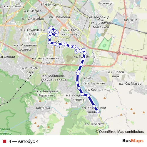 See why over 2 million users trust and consider busmaps.com as the best public transport website. busmaps gives you Sofia Buses suggested routes, real-time bus tracker, line route maps in Sofia, and helps to find the closest 4 bus stops near you. No internet available? Download an offline PDF map and bus schedule for the 4 bus to take on your trip.